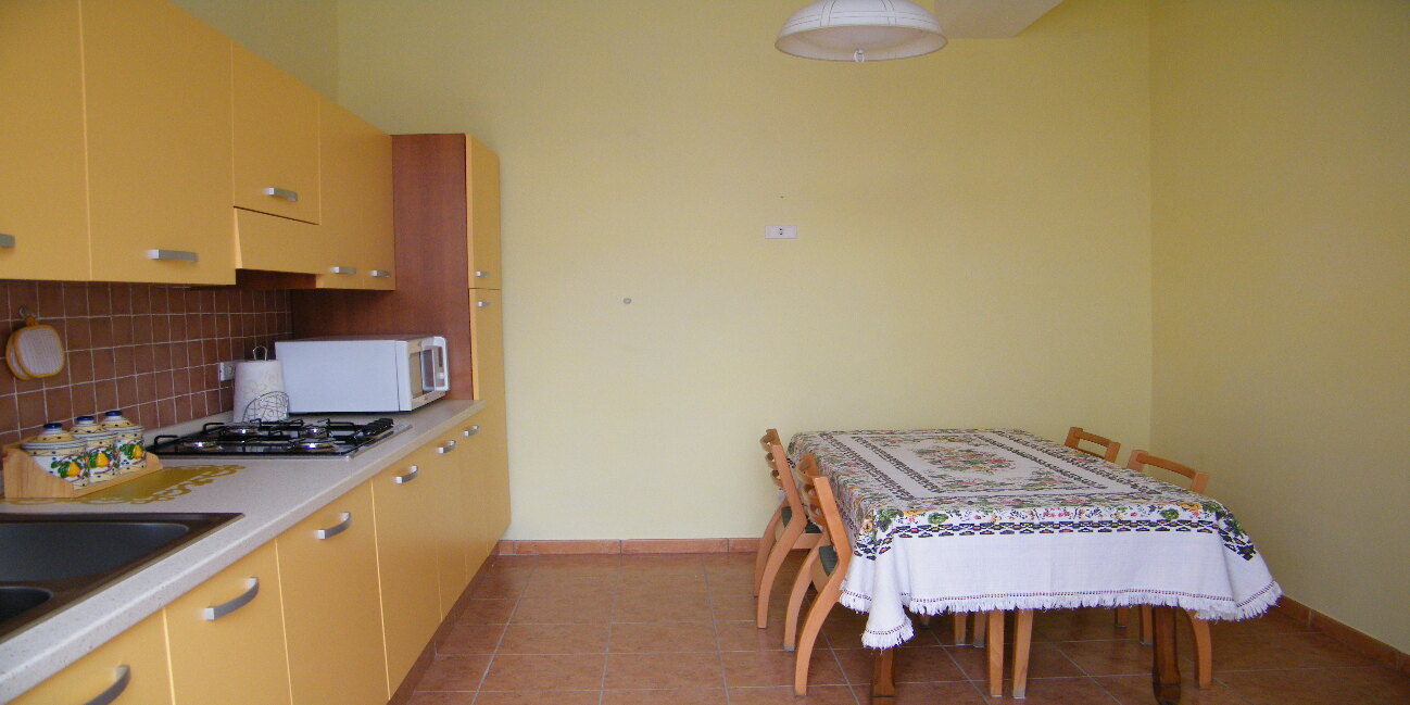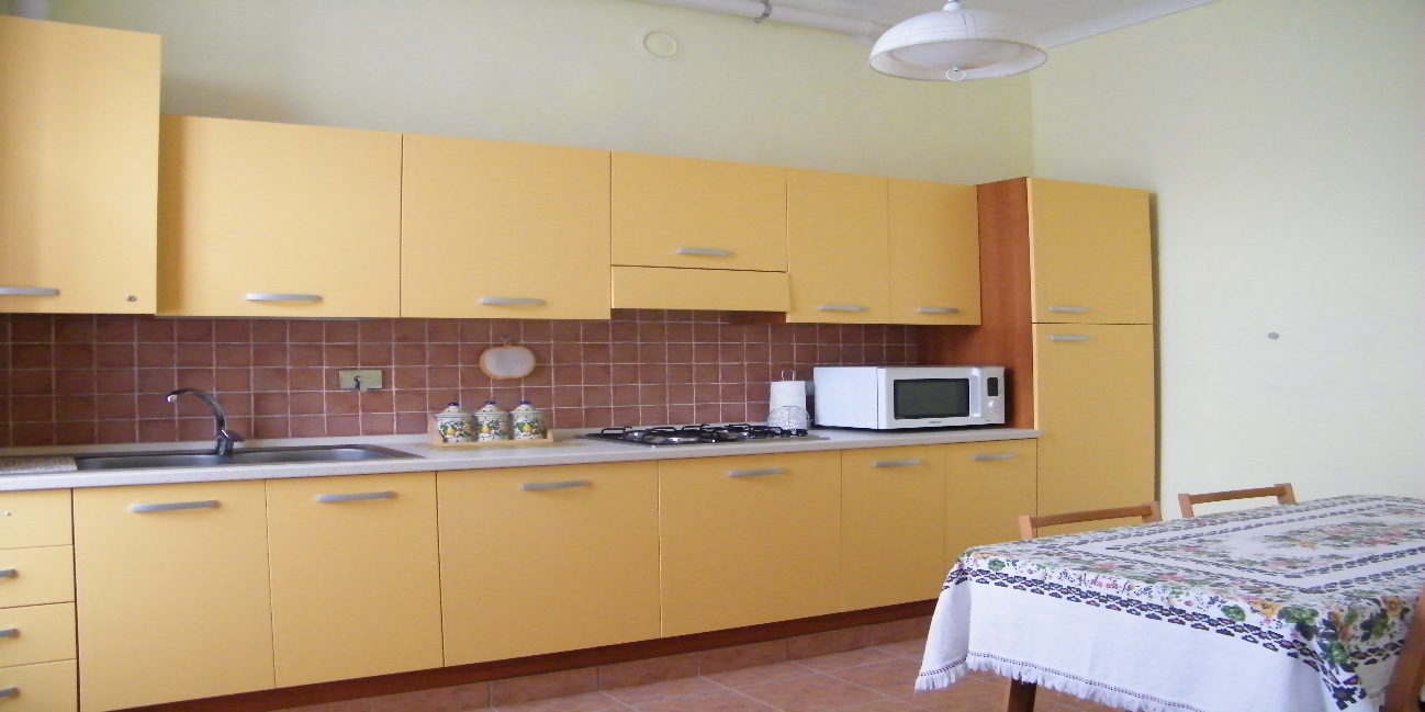 In cucina ; tavolo, sedie ,lavastoviglie ,microonde, frigorifero , frizer ,stoviglie .